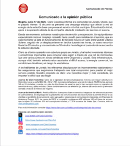 “Esta situación inicial, ajena a la operación directa de la compañía, afectó la prestación del servicio en la zona. Desde ese momento, activamos nuestro plan de atención y recuperación. Un equipo técnico especializado inició el complejo recorrido hacia Juradó para restablecer el servicio, que en este momento ya está en funcionamiento. El trayecto incluye un vuelo entre Quibdó y Bahía Solano, seguido de un desplazamiento en lancha durante tres horas, un nuevo recorrido fluvial de 20 minutos y una caminata de 30 minutos hasta llegar al punto donde se encuentra la estación afectada”, dice el comunicado de Claro.