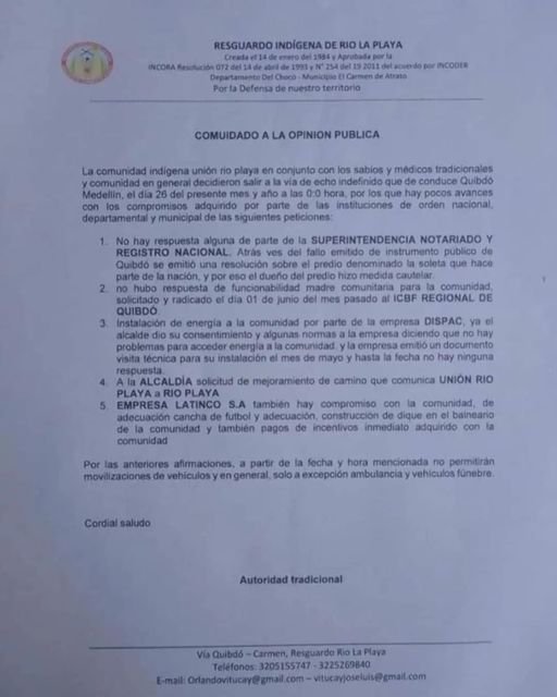La comunidad indígena unión rio playa en conjunto con los sabios y médicos tradicionales y comunidad en general decidieron salir a la vía de echo indefinido que de conduce Quibdo Medellín, el día 26 del presente mes y año a las 0:0 hora, por los que hay pocos avances con los compromisos adquirido por parte de las instituciones de orden nacional, departamental y municipal de las siguientes peticiones: