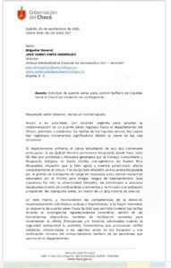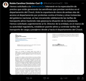 “Acudo a su autoridad, con carácter urgente, para solicitar la implementación de un puente aéreo regulado hacia el departamento del Chocó, orientado a estabilizar las tarifas de los tiquetes aéreos, las cuales han registrado incrementos significativos debido al cierre de las vías terrestres”, señaló Córdoba en la comunicación oficial.