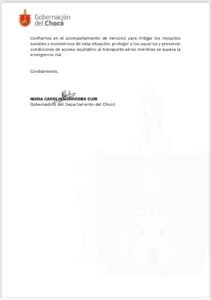 En una carta enviada al director de la Aerocivil, brigadier general José Henry Pinto Rodríguez, la gobernadora solicitó evaluar medidas que permitan ampliar la oferta de vuelos, con más frecuencias u horarios adicionales cuando la seguridad lo permita, y establecer lineamientos que promuevan tarifas solidarias mientras dure la emergencia.