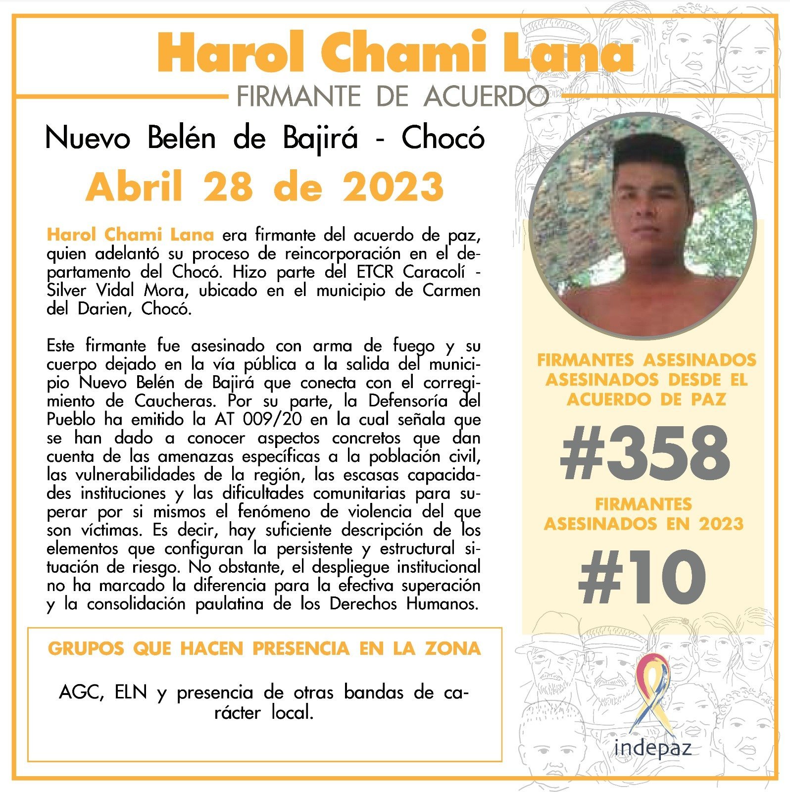 Harol Chamí Lana, firmante de los acuerdos de paz de la antigua guerrilla de las Farc, fue asesinado el 28 de abril en Nuevo Belén de Bajirá. La víctima que se encontraba adelantando su proceso de reincorporación y fue atacada a disparos en la vía que comunica a nuevo Belén de Bajirá, Chocó, con Caucheras.