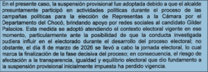 El funcionario fue suspendido provisionalmente de su cargo el pasado 12 de febrero por la Procuraduría Regional de Instrucción de Chocó, señalado de publicar aparentemente en su cuenta de la red social Facebook un mensaje de apoyo en favor del candidato a la Cámara de Representantes Gilder Palacios.
