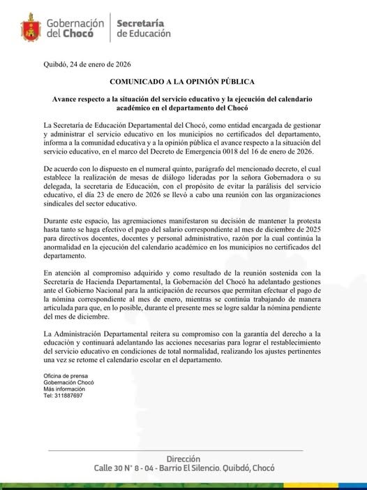 Ante este panorama, la Gobernación del Chocó reiteró su compromiso con el sector educativo y explicó que, luego de un encuentro con la Secretaría de Hacienda Departamental, se adelantan gestiones ante el Gobierno Nacional para lograr la anticipación de recursos.