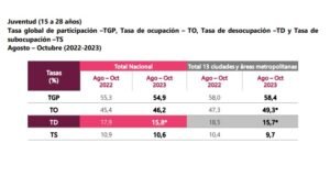 La tasa de desocupación para de los jóvenes de 15 a 28 años en el total nacional en el trimestre móvil agosto-octubre de 2023 fue del 15,8 %, mientras que en el periodo móvil agosto-octubre de 2022 fue del 17,9 % (Variación estadísticamente significativa).