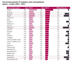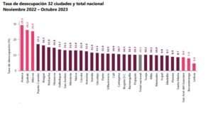 En cuanto al total de las 32 ciudades, Arauca y Quibdó presentaron las tasas de desocupación más altas en el periodo móvil que va de noviembre de 2022 a octubre de 2023 con el 29,3 % y el 26,2 %, respectivamente, mientras que las más bajas fueron para Leticia con el 4,6% y para